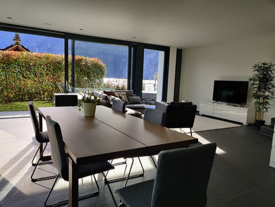 grosszügiger Wohnraum mit Sonnenterrasse und Blick auf See und Berge
